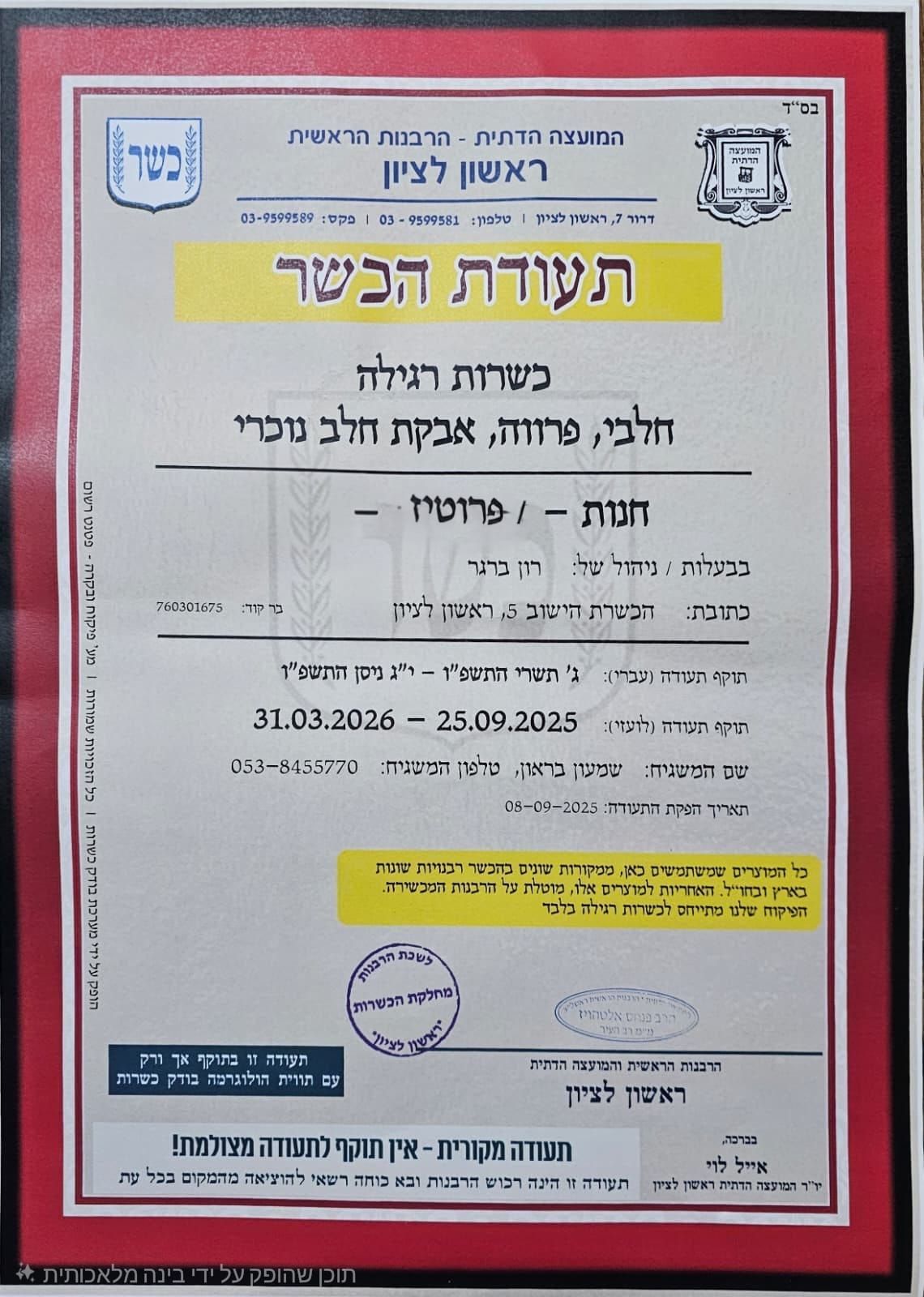 אנו מחזיקים בתעודת כשרות מלאה בהשגחת הרבנות חולון